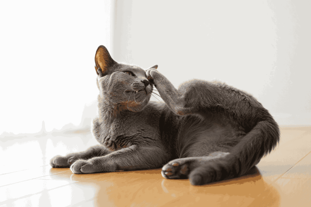 • Зуд и расчесы: животное чешется, особенно в области морды, ушей, шеи, лап и живота. Часто появляются расцарапанные участки.