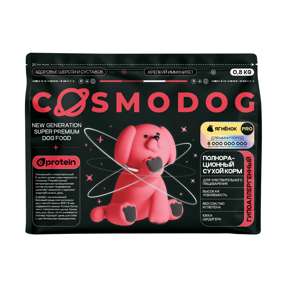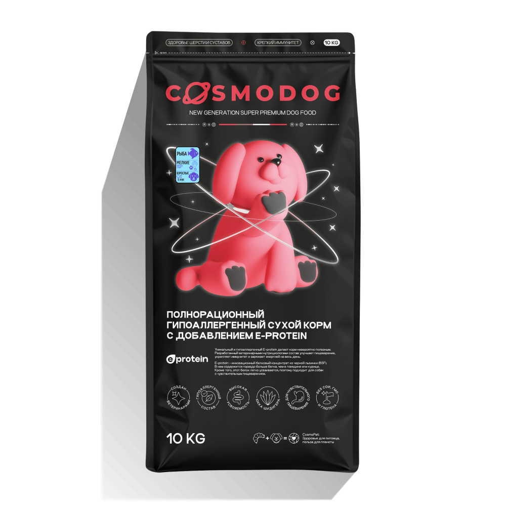 — Уникальные продукты, такие как Cosmodog — с энтопротеином и гипоаллергенной формулой.